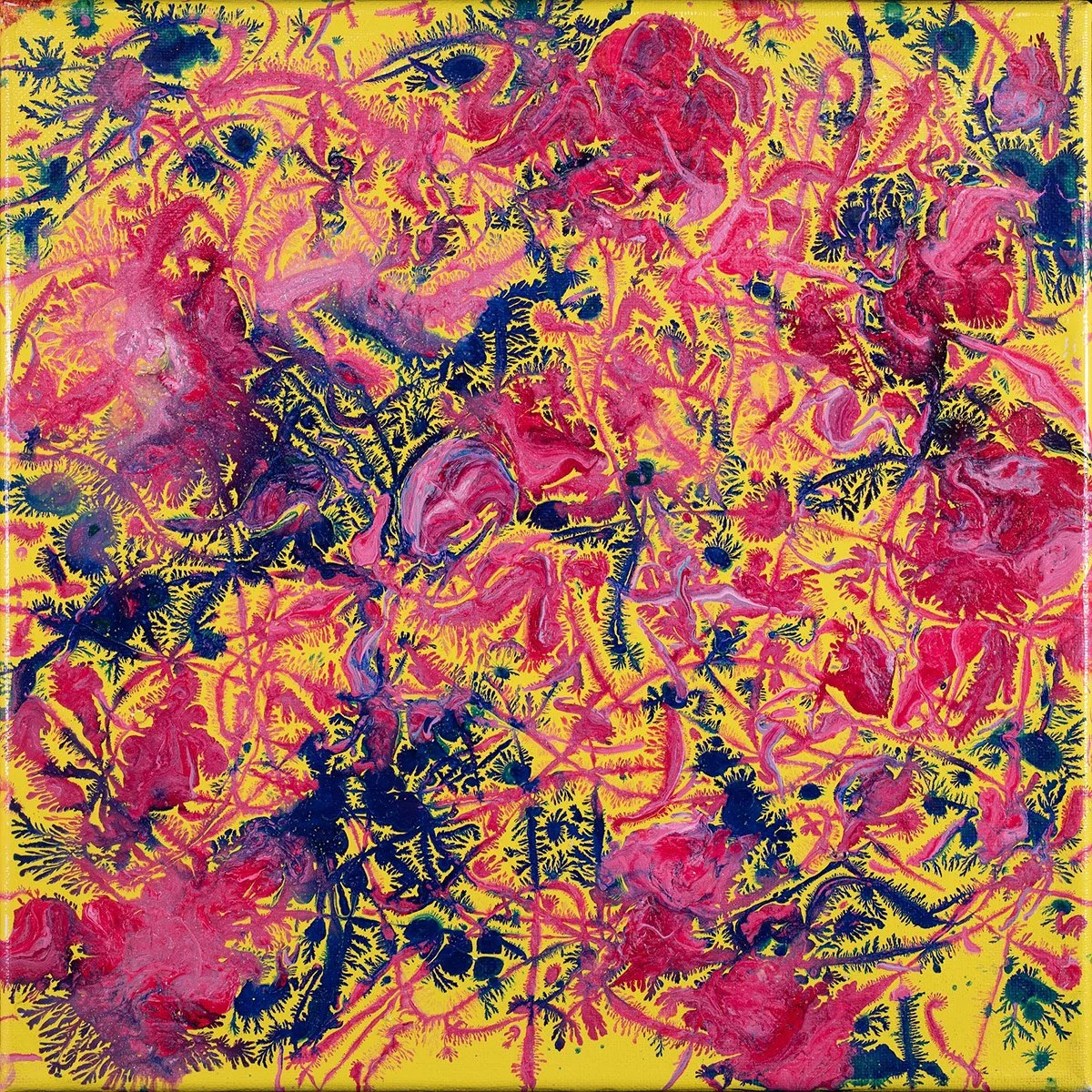 BIOTIC ROMANCE: 12”x12”, Acrylic, ink, and mistinted paint byproduct on canvas.